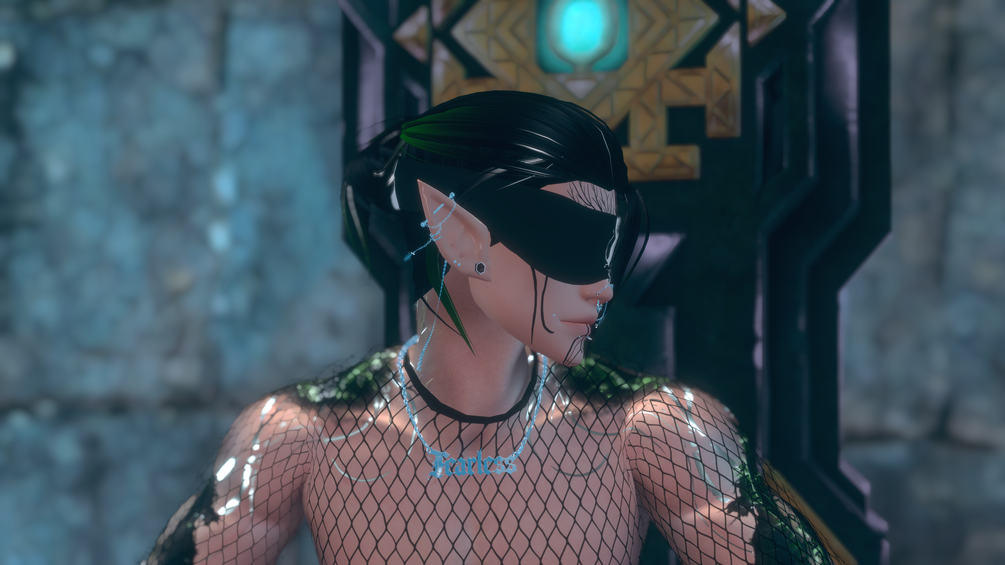 - Belt, fearless necklace, arm chains, hand chains with rings, gothic piercings, guages, face piercings, face chain, glasses, blindfold